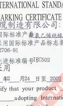 國(guó)家技術(shù)監(jiān)督局采用國(guó)際標(biāo)準(zhǔn)證書(shū)(聚氯乙烯絕緣和護(hù)套電力電纜)