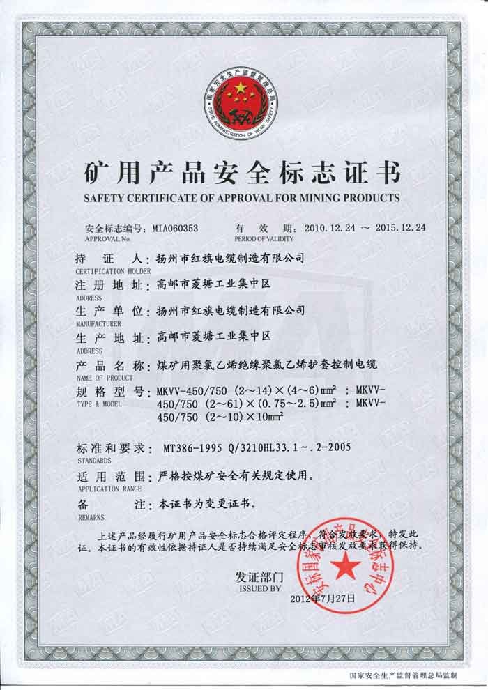 煤礦礦用產(chǎn)品安全標志證書-MKVV