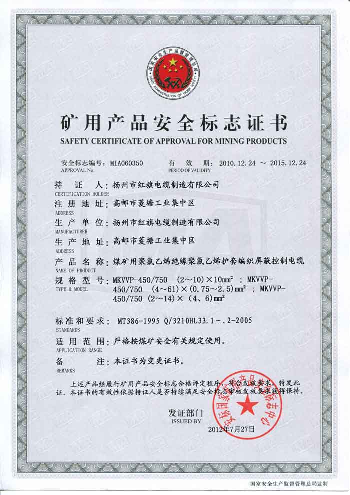 煤礦礦用產(chǎn)品安全標(biāo)志證書-MKVVP